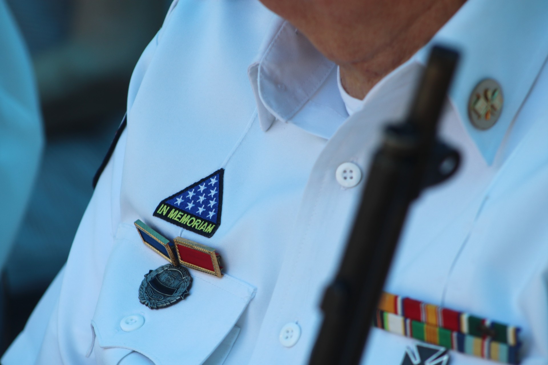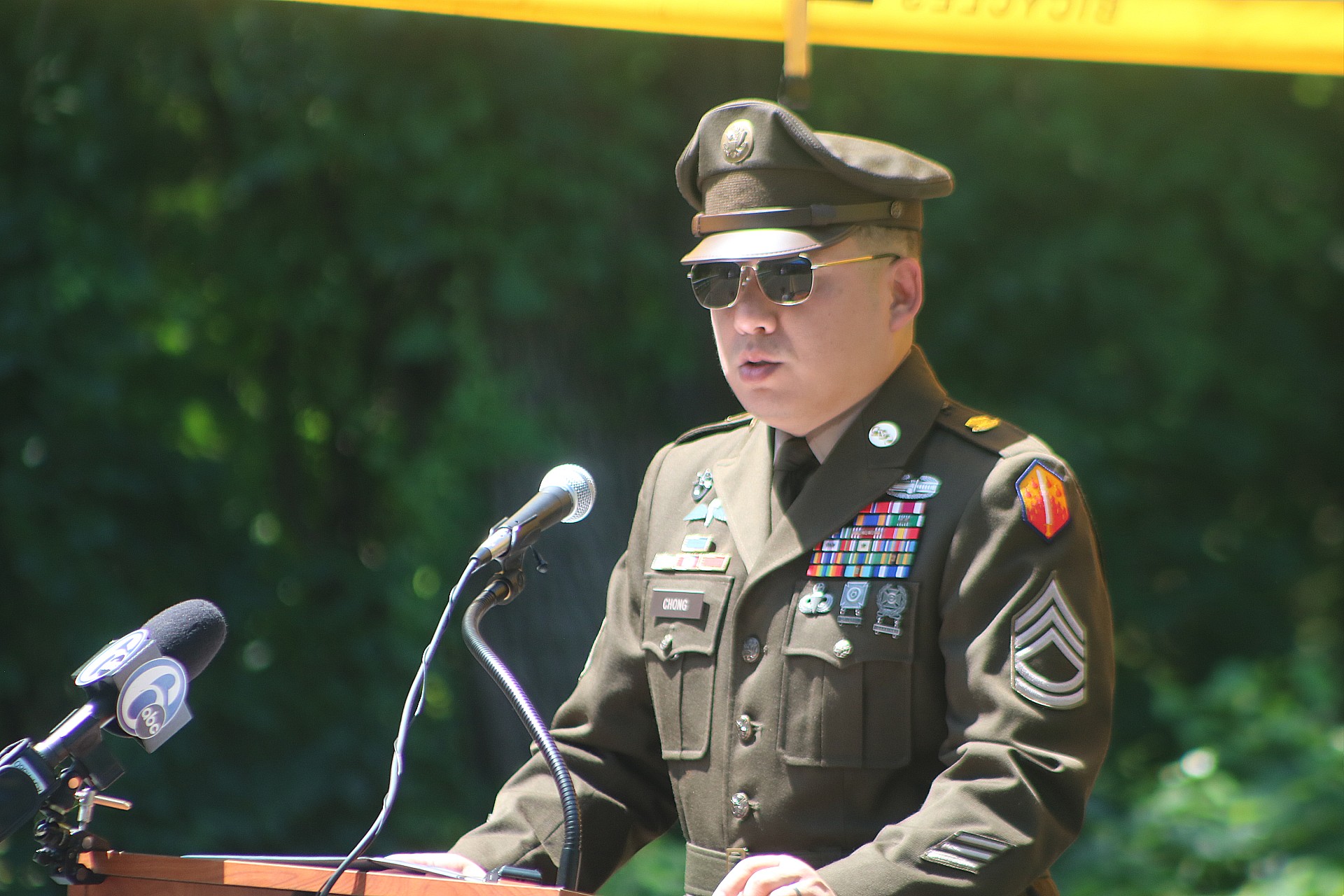 The ceremony featured a flyover by a restored UH-1C helicopter from the Liberty War Birds Association.