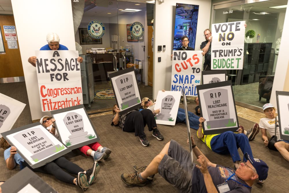 Protesters staged a “die-in” outside Republican Congressman Brian Fitzpatrick’s office Wednesday to oppose the “Big Beautiful Bill” ahead of a House vote.
