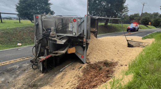 The truck overturned and spilled part of its load of sand on Windy Bush Road.