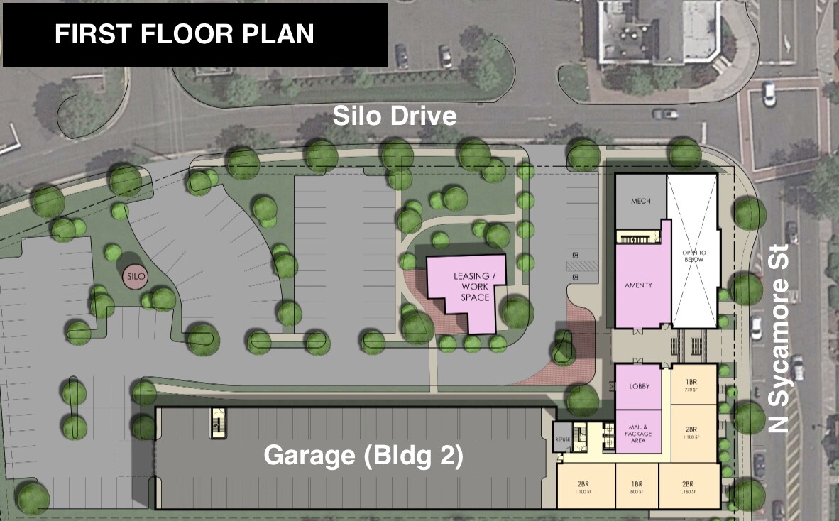 The plan from Goodnoe Homestead LLC calls for a multi-story building at North Sycamore Street and Silo Drive that would include 73 residential units and retail space. The proposal outlines a total building area of 111,509 square feet, with 88,074 square feet dedicated to residential use.