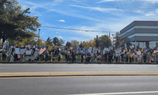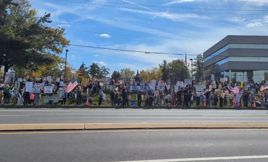 A large crowd gathered outside Republican Congressman Brian Fitzpatrick’s office along the Newtown Bypass in Middletown Township.